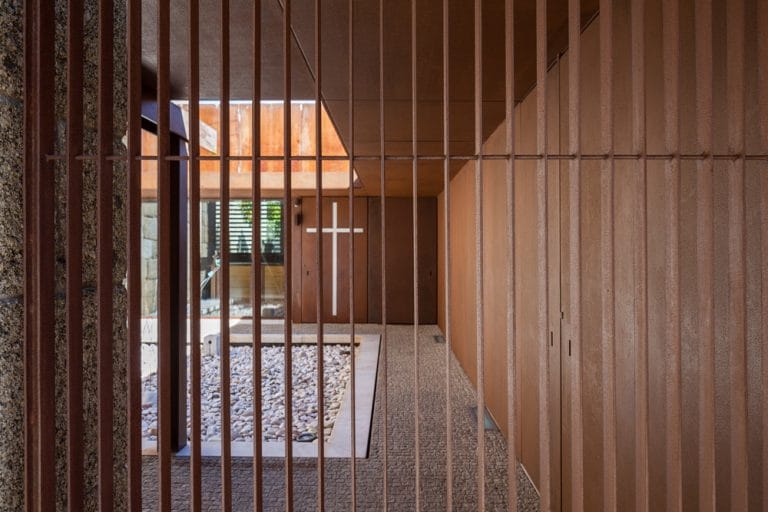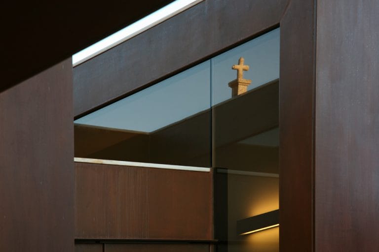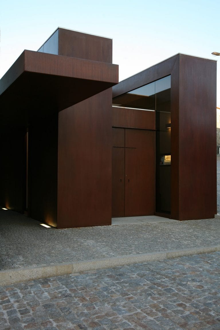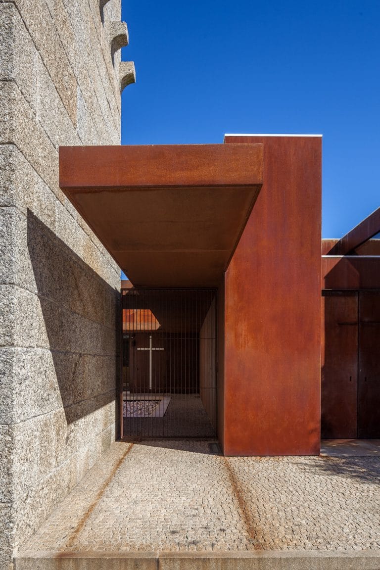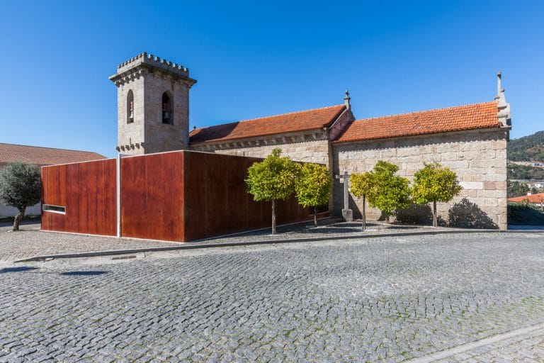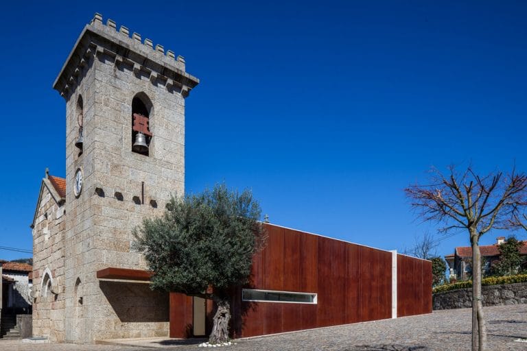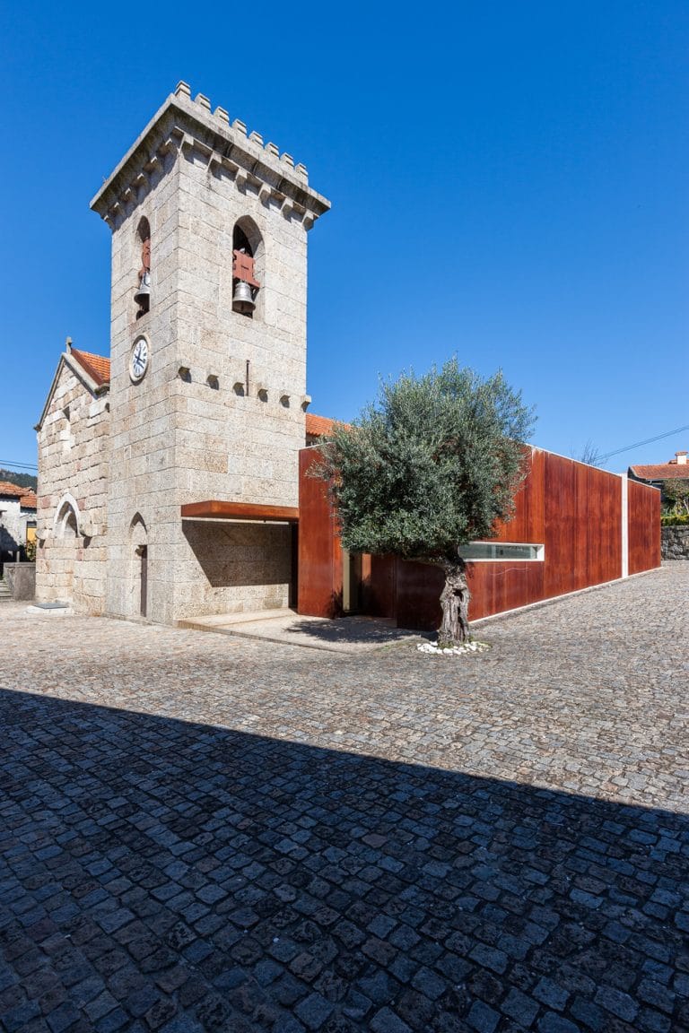 O novo volume, revestido a aço corten, mostra-se um elemento independente da Igreja e recebe a Sacristia, a Capela Mortuária e os sanitários de apoio. A sacristia relaciona-se com o presbitério da Igreja através de uma ligação em vidro que constitui o único ponto de contacto entre as construções. As coberturas aproximam-se mas não tocam no corpo da igreja. Como resultado da composição houve interesse em manter a verticalidade que a Torre oferece à composição.